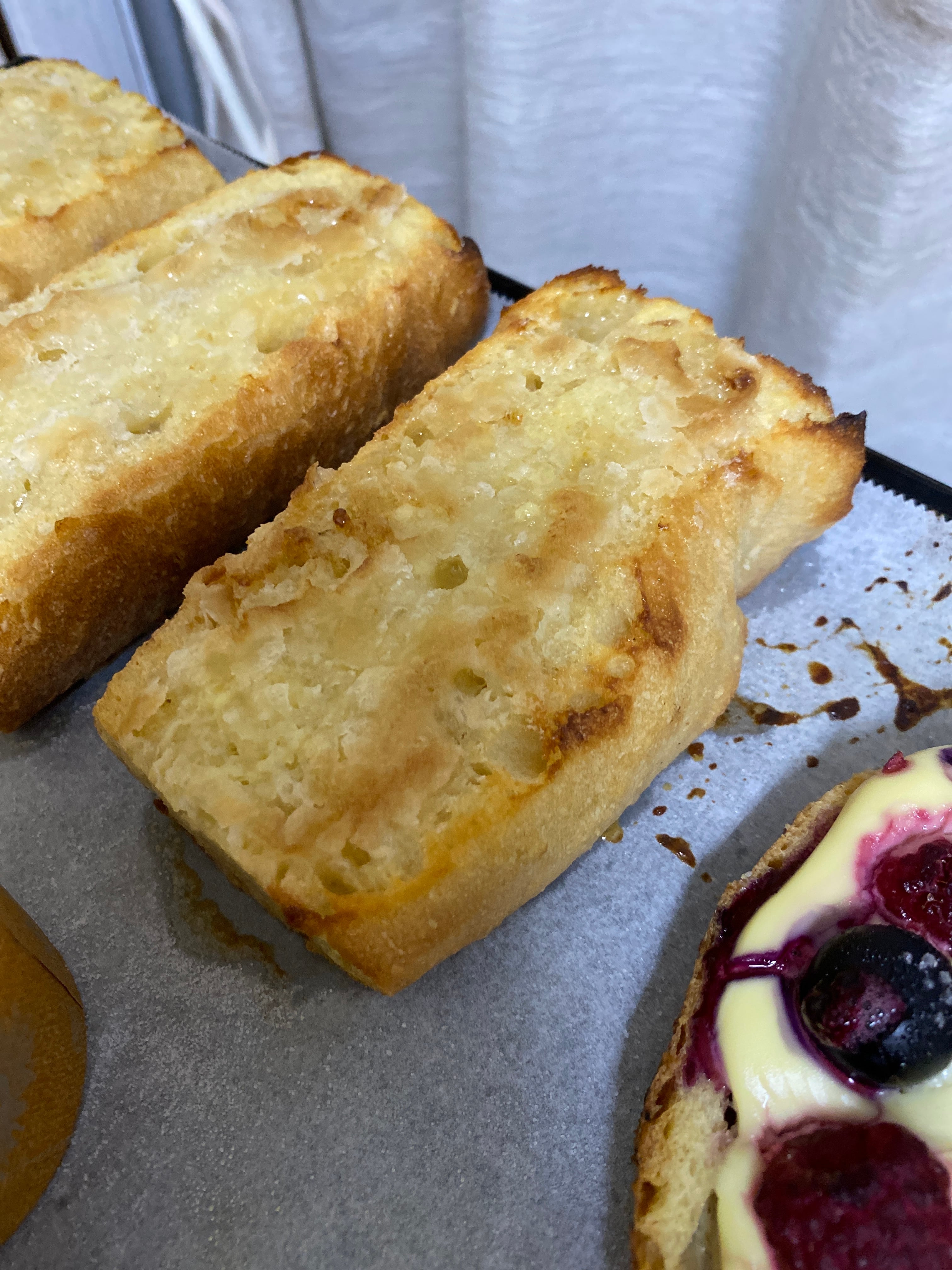 バゲットをフレンチトーストにしています。ハード系のフレンチトーストは優しい食感が残りもちもちとしていてとても美味しいです。